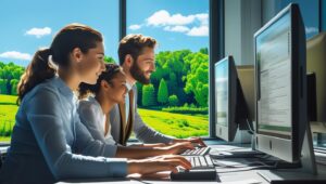 uztaisi bildi kur 3 baltādaini cilvēki strādā pie datora, atrodas ofisā un ārā pa logu redzama daba